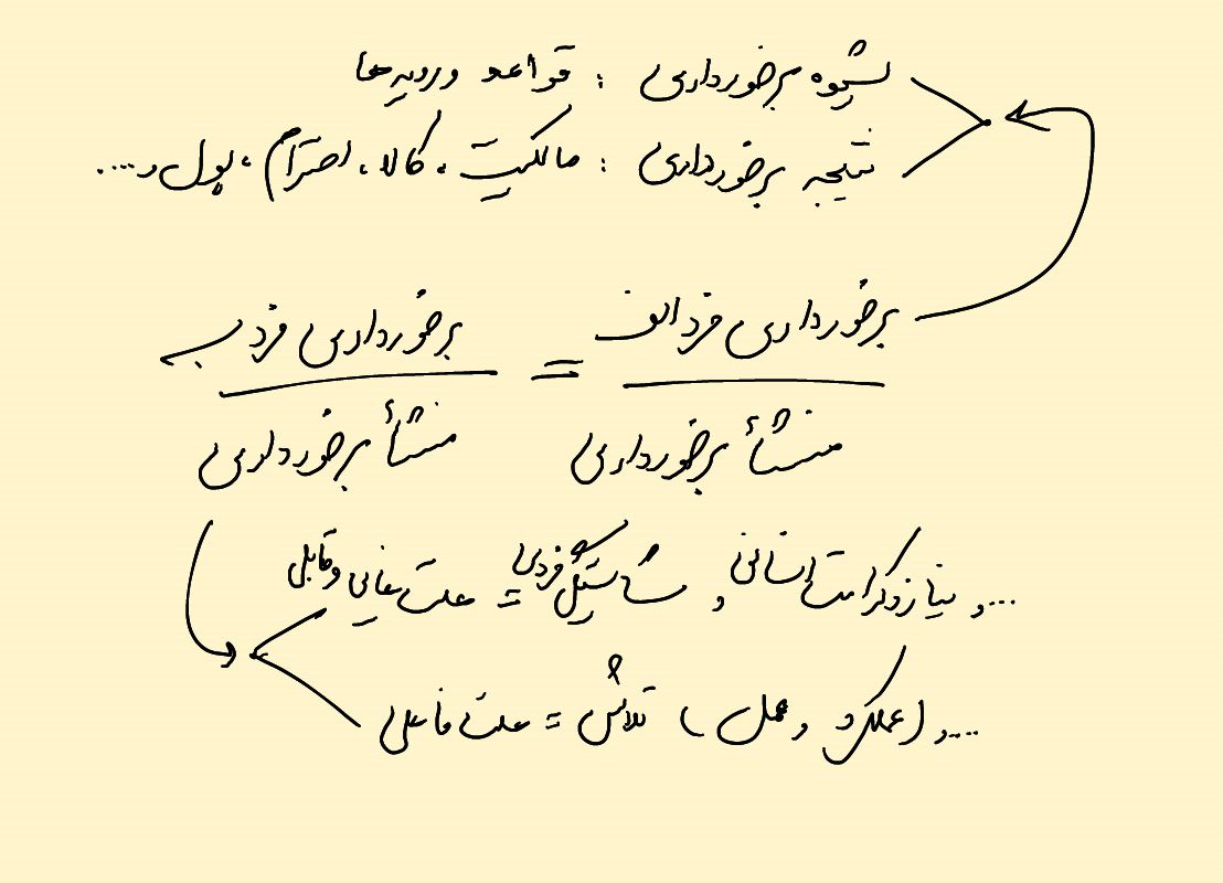 برخورداری ها نیز عبارتند از نتیجه برخورداری و شیوه برخورداری. نتیجه برخورداری شامل کالا (مکیل، موزون، عدد)، قیمت، مطلوبیت، نسبت مطلوبیت به قیمت، قدرت، مالکیت، احترام، اطلاعات و ... است. شیوه برخورداری نیز در عین بی طرفانه بودن، مجموعه ای از قواعد توزیع نتیجه را در بر دارد مثل غرری نبودن و .... .